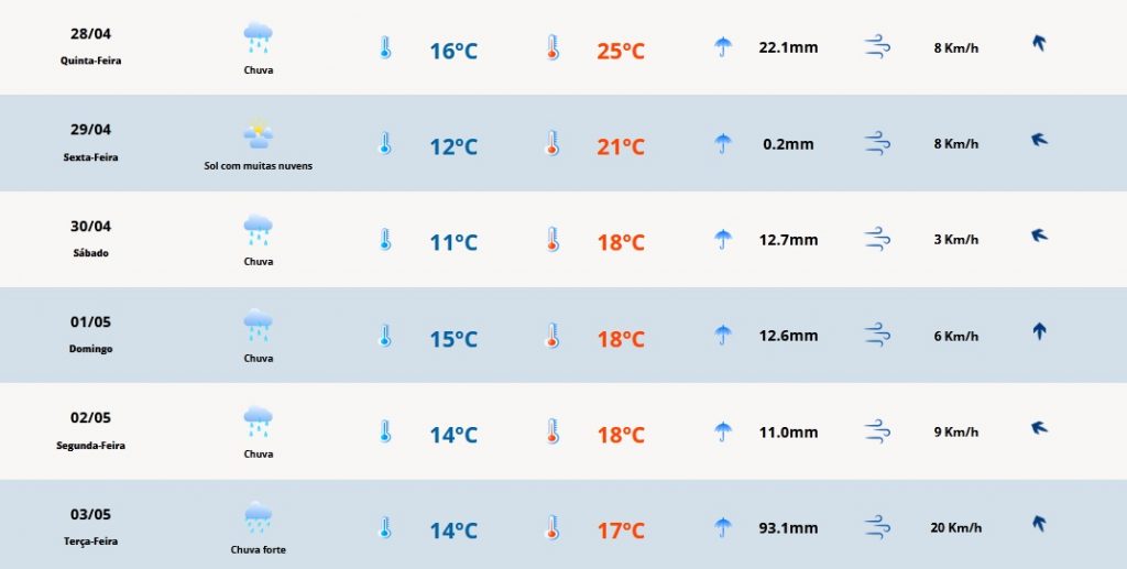 Nesta quinta-feira, alguns municípios devem superar os 100 milímetros de chuva, representando novos alagamentos e subida de arroios e córregos. Para Santa Cruz do Sul, a previsão é de que pouco passe dos 20 milímetros, com a temperatura variando entre 16 e 25 graus.