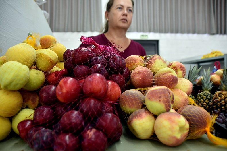 Também na Feira Central, o casal Bernardete Goetze, 47, e Norberto Goetze, 50 anos, vende uma diversidade de frutas da época, como abacaxi, pêssego, ameixa, laranja e uva. Bernardete conta que os produtos são oriundos de Flores da Cunha.