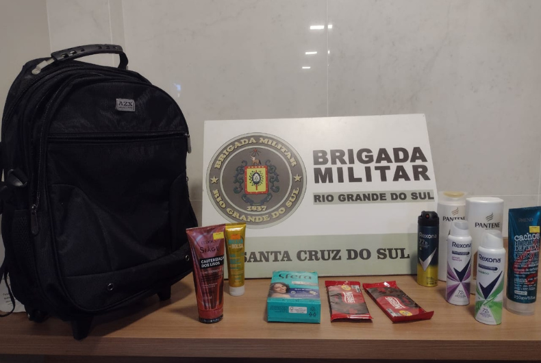 Uma guarnição foi acionada através do Centro Integrado de Comando e Controle (CICC) e deslocou até o local. Em revista na ladra, os policiais localizaram outros itens oriundos de furto em estabelecimentos do Centro da cidade que ela já havia escondido dentro da mochila que pretendia furtar. Foram apreendidos objetos levados de uma farmácia, como três desodorantes da marca Rexona, um condicionador, um creme da marca Pantene e quatro cremes Herus.
