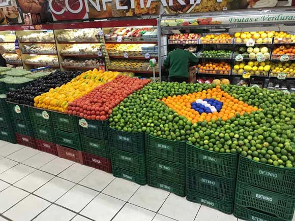 O clima de Copa do Mundo se intensificou em Santa Cruz do Sul nos últimos dias. Além das vitrines decoradas no Centro nas cores verde e amarelo, funcionários que cuidam da fruteira do Supermercado Miller, da Avenida Independência, capricharam nessa quinta-feira, 5. Organizaram os legumes e frutas que ficam expostos e formaram as bandeiras de Brasil e Bélgica. Não é a primeira vez que isso é feito, para encantamento dos clientes.