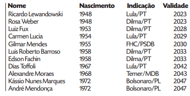 Como a aposentadoria compulsória tem como referência e limite os 75 anos de idade, você, gostando ou não gostando dos atuais ministros, veja abaixo até que ano cada um poderá permanecer no Supremo Tribunal Federal. Salvo ato de renúncia pessoal ou impedimento por ação do Senado Federal.