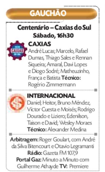 Ainda longe do ideal sob o comando do técnico Alexander Medina, o Internacional enfrenta o Caxias neste sábado, 12, no Estádio Centenário, pela sexta rodada do Gauchão. A bola rola a partir das 16h30.