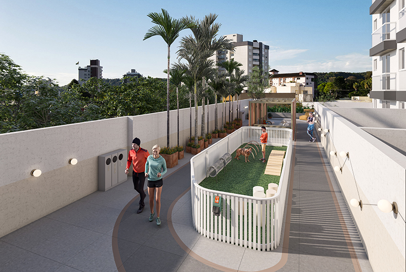Um terraço, na altura do quarto andar, será ponto de encontro entre os moradores. É o local destinado para o espaço bem-estar, a área de convívio para conversar com amigos, além de praticar caminhada ou corrida. É aí que as crianças vão se divertir, pois Gaia contará com playground completo, feito para a garantia de bons momentos e com a segurança. “Além dos nossos filhos, temos que pensar nos novos filhos, que são os pets”, afirma Franck. E para os bichinhos, que passaram a fazer parte da família, está projetado o pet place.