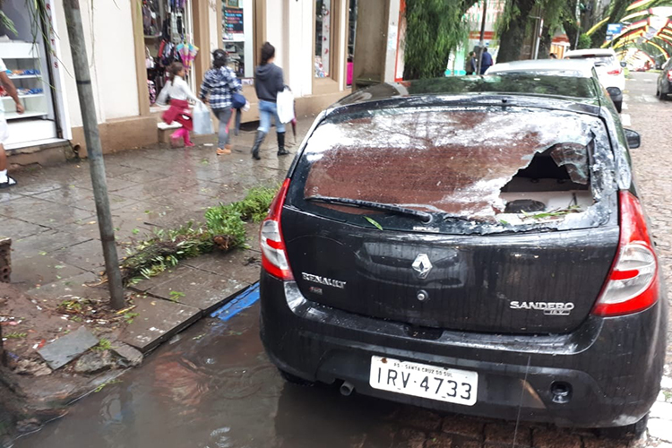 A condutora de um carro levou um susto no início da tarde desta quarta-feira, 30, no Centro de Santa Cruz do Sul. Por volta das 14h30, um galho de tipuana quebrou e caiu, atingindo o veículo que trafegava pela Rua Marechal Floriano.