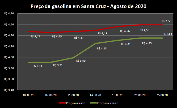 Conforme a pesquisa mais recente, publicada nessa terça-feira, 25, o litro da gasolina comum mais em conta no mercado santa-cruzense custa R$ 4,35 – bem acima se comparado ao início do mês, quando o valor não chegava aos R$ 4,00. O valor mais alto, no entanto, mantém estabilidade, variando entre R$ 4,47, no começo do mês, e R$ 4,59, resultado da pesquisa mais recente.