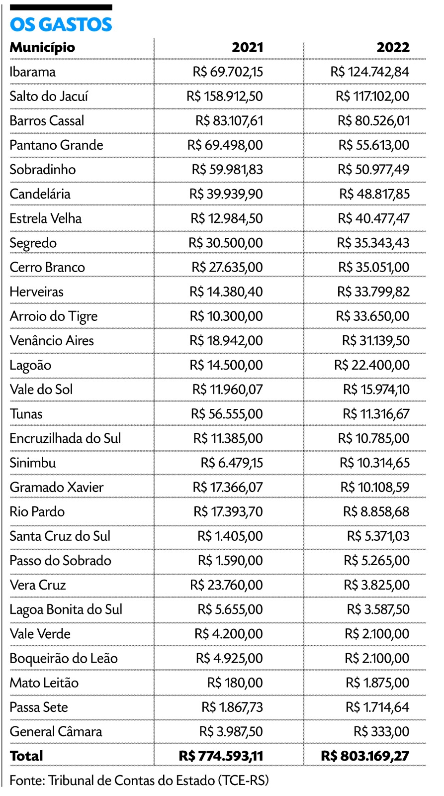 Os números estão disponíveis para consulta pública no site do TCE. Das 28 câmaras do Vale do Rio Pardo, 16 registraram gastos inferiores ao do ano anterior com diárias. Em alguns casos, porém, o crescimento nas despesas foi significativo. Em Estrela Velha, por exemplo, o valor mais do que triplicou, passando de R$ 12,9 para R$ 40,4 mil. Entre 2020 e 2021, os gastos dos órgãos públicos com diárias despencaram em função das restrições de circulação impostas durante a fase mais aguda da pandemia.