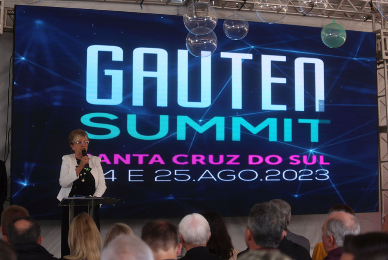 Representando o governador Eduardo Leite, a secretária estadual de Inovação, Simone Stülp, apontou o foco do Rio Grande do Sul em tornar-se mais competitivo, a partir de ações, programas de incentivo e parceria com os municípios na realização de eventos como o Gauten Summit.