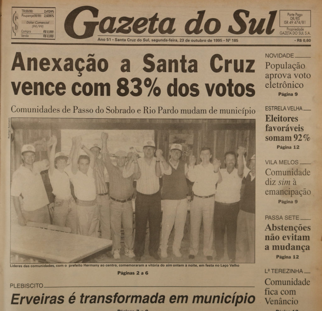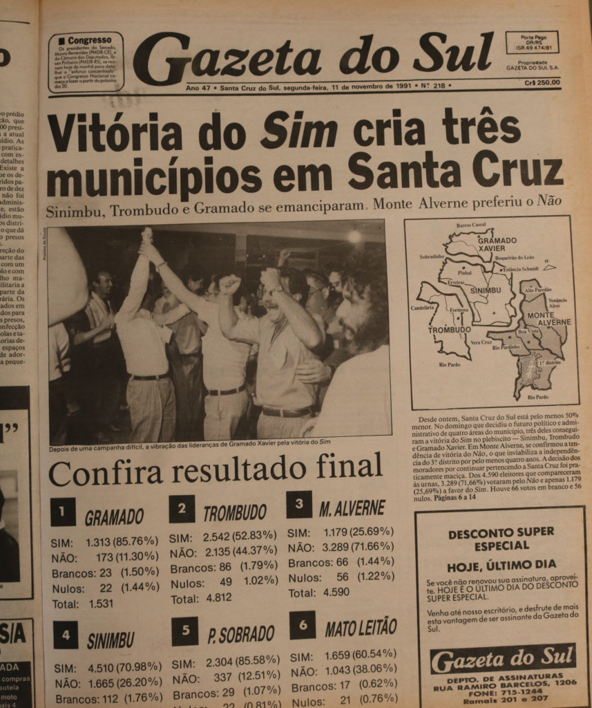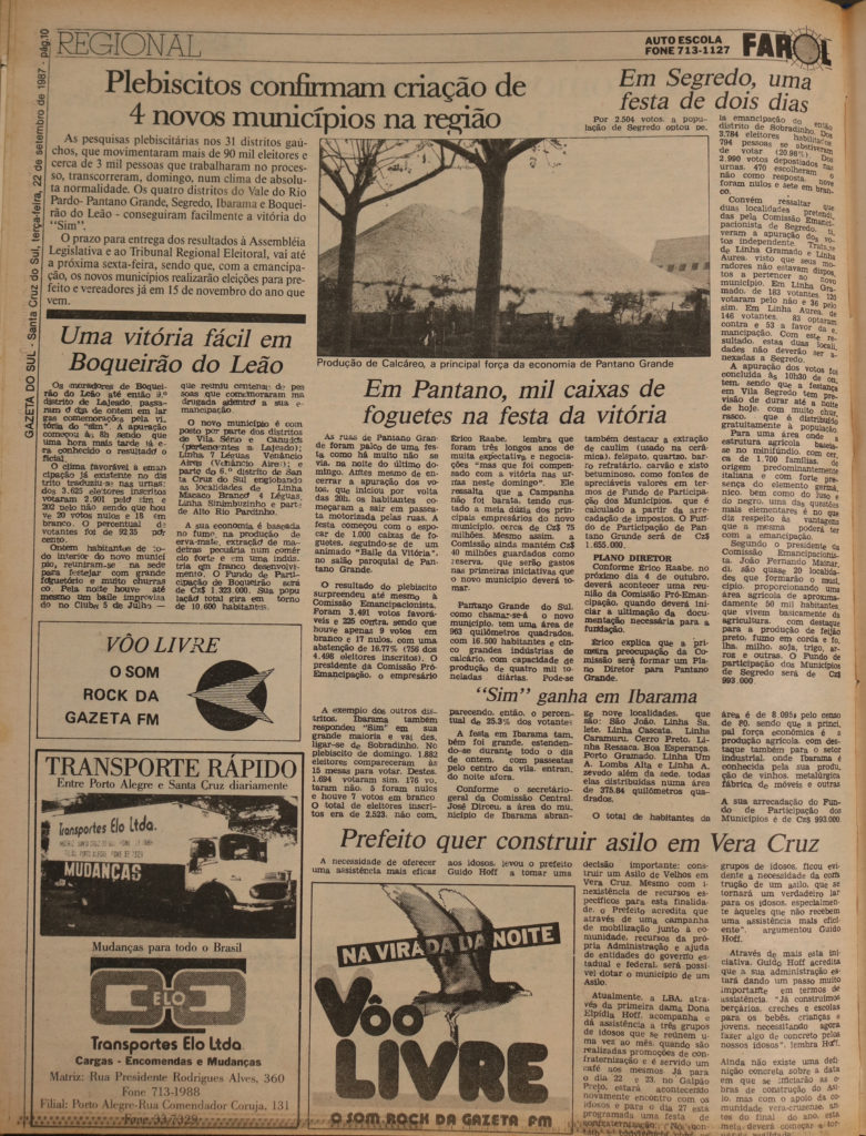 “As pesquisas plebiscitárias nos 31 distritos gaúchos, que movimentaram mais de 90 mil eleitores e cerca de 3 mil pessoas que trabalharam no processo, transcorreram, domingo, num clima de absoluta normalidade. Os quatro distritos do Vale do Rio Pardo – Pantano Grande, Segredo, Ibarama e Boqueirão do Leão – conseguiram facilmente a vitória do ‘sim’. O prazo para entrega dos resultados à Assembleia Legislativa e ao Tribunal Regional Eleitoral vai até a próxima sexta-feira, sendo que, com a emancipação, os novos municípios realizarão eleições para prefeito e vereadores já em 15 de novembro do ano que vem”, diz o texto de abertura da matéria publicada na época.