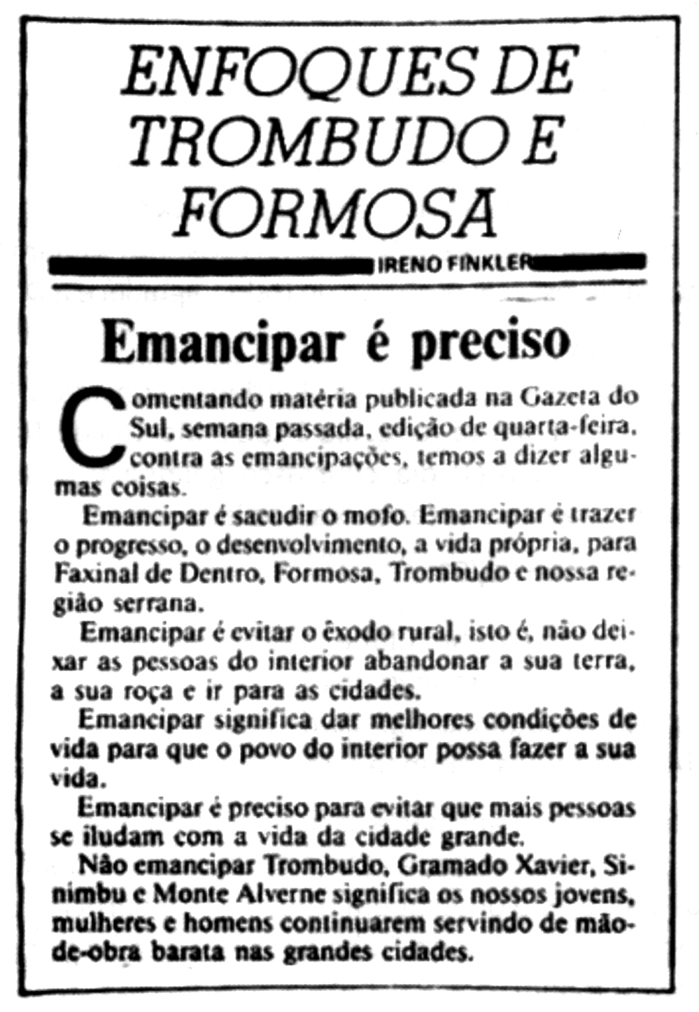 “Quem manda? É a opinião da maioria que deve mandar. É o povo que deve mandar.” Foi com essa afirmação que Ireno Finkler encerrou sua primeira contribuição nas páginas do jornal Gazeta do Sul, em outubro de 1987. Nascia aí a Enfoque de Trombudo (nome do distrito que fazia parte de Santa Cruz do Sul), uma coluna semanal na qual, por quase três décadas, narrou com detalhes a jornada de criação do município que viria a tornar-se Vale do Sol.