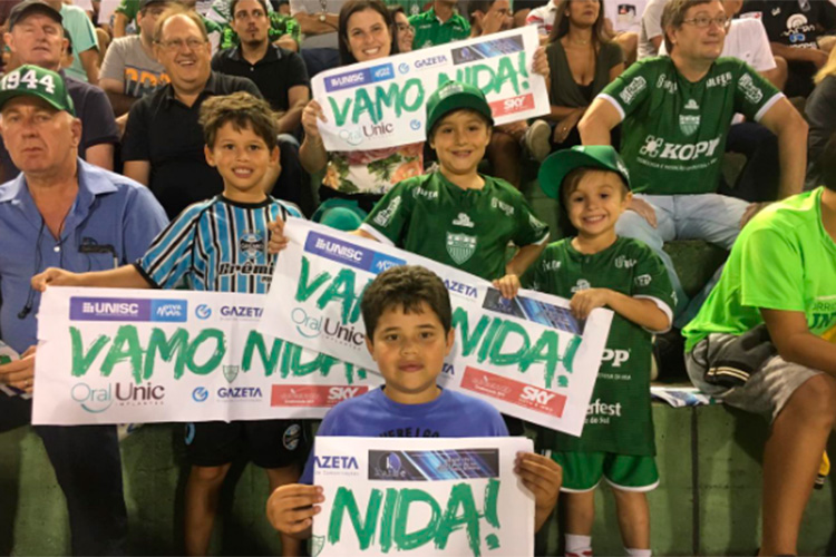 A Gazeta Grupo de Comunicações distribuiu 2 mil faixas com a frase “Vamo Nida!” antes do jogo desta quarta-feira, 13, no Estádio dos Eucaliptos. Uma forma de apoiar o Periquito rumo à vitória. A faixa foi produzida com o apoio da Unisc, OralUnic, Satcenter Sky e Joalheira e Ótica Kothe.