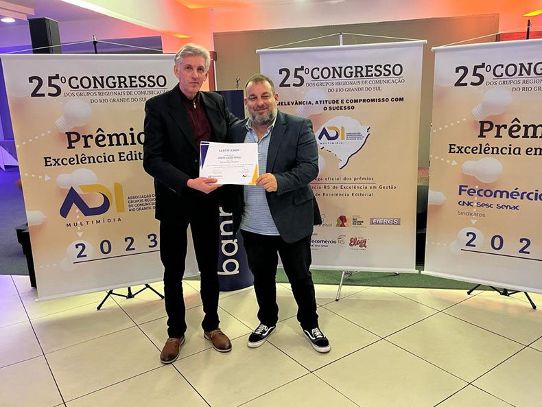 Uma reportagem publicada pela Gazeta do Sul, na edição de 4 de fevereiro deste ano, foi contemplada no último sábado, 14, com o segundo lugar no Prêmio de Excelência Editorial no 25o Congresso dos Grupos Regionais de Comunicação do Rio Grande do Sul, realizado no Tri Hotel, em Canela, na Serra Gaúcha. A matéria “Educação em três tempos – Desafios e novidades da rede pública estadual a partir de 2023” é de autoria da jornalista cachoeirense Caroline Garske, que na época integrava a equipe da Redação Integrada da Gazeta e atualmente trabalha junto ao Correio do Povo. Quem recebeu o certificado em nome de Caroline, no evento de sábado, foi o gestor de Conteúdo Multimídia da Gazeta, Romar Rudolfo Beling.