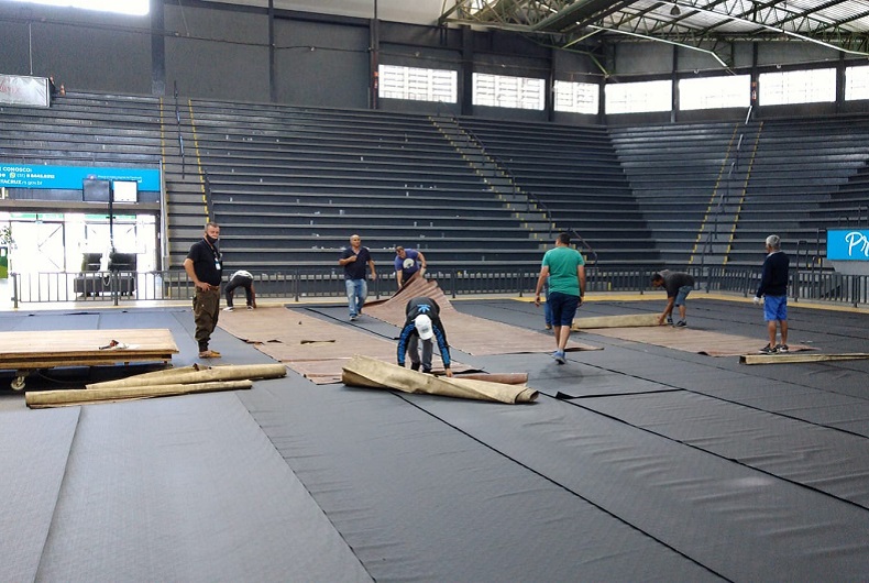 A quadra foi coberta com um material emborrachado. Depois, a equipe responsável inseriu uma manta vinílica do tipo paviflex. Na sequência, as estruturas de madeira que irão compor os três tablados de apresentações foram instaladas.