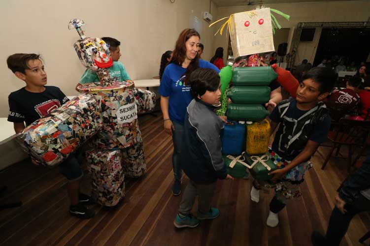 Na manhã de sexta-feira, a última tarefa ainda deveria ser cumprida. As escolas precisavam entregar um mascote, confeccionado com materiais reciclados. Houve também um desfile de fantasias, criadas com os objetos coletados na ação das escolas.
