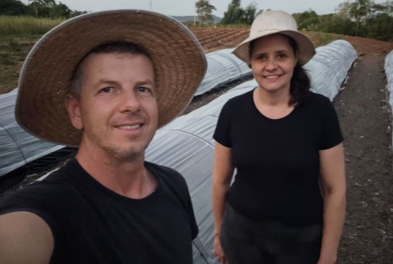 O produtor Giovane Luiz Weber e a esposa Louvane junto aos canteiros da nova safra