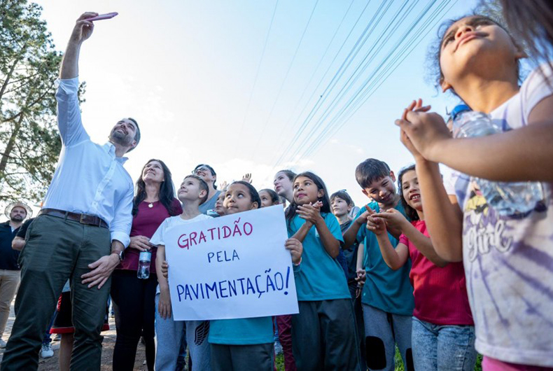 Durante a vistoria, o governador encontrou alunos da Escola Padre Benno Müller, localizada na beira da estrada que está recebendo asfalto. As crianças, ao lado de professoras, esperavam por Leite com cartazes de agradecimento pela obra, que está qualificando o acesso ao colégio e garantindo mais segurança para quem trafega pelo local.