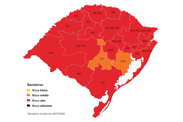 Na 30ª rodada, o mapa definitivo do modelo de Distanciamento Controlado terá, a partir desta terça-feira, 1º, 19 regiões em bandeira vermelha (risco epidemiológico alto). Apenas dois dos 11 pedidos de reconsideração enviados por municípios e associações regionais foram acatados pelo Gabinete de Crise nesta segunda-feira, 30. As regiões de Cachoeira do Sul e Guaíba, portanto, permanecem em bandeira laranja (risco epidemiológico médio).