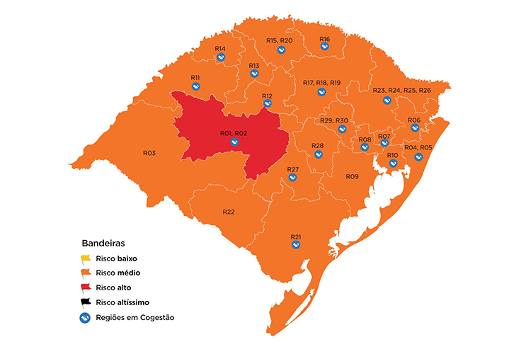 O mapa com apenas uma região em bandeira vermelha já foi registrado no Estado na primeira rodada do modelo, com vigência de 11 a 17 de maio, e quando ainda eram consideradas 20 regiões Covid. Na ocasião, apenas a região de Lajeado foi classificada em vermelho, mas seis regiões (Uruguaiana, Santa Rosa, Ijuí, Taquara, Bagé e Cachoeira do Sul) estavam na bandeira amarela (risco epidemiológico baixo). Desde a oitava rodada, entre os dias 30 de junho e 6 de julho, o Rio Grande do Sul não tem bandeira amarela.