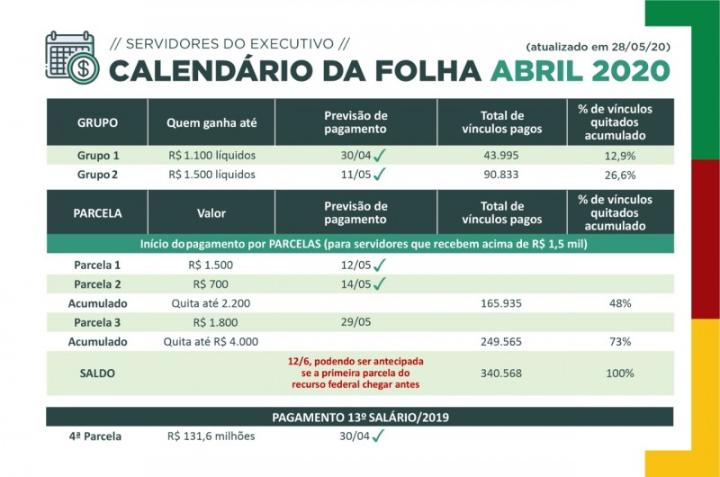 A quitação total da folha de abril segue prevista para o dia 12 de junho, mas será antecipada caso a primeira parcela de R$ 486,3 milhões do auxílio financeiro aos estados (Lei Complementar 173/2020) seja depositada pela União antes disso, pois o repasse garantiria recursos suficientes para quitar o restante ainda em aberto.