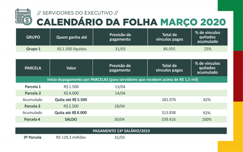 O pagamento dos salários de março será pela sistemática mista de grupos e parcelas. Nesta terça-feira, 31, o Tesouro do Estado quita a folha para o grupo de servidores que recebem líquido até R$ 1,5 mil (25% dos vínculos). Também no dia 31 será paga a terceira parcela do 13º de 2019.