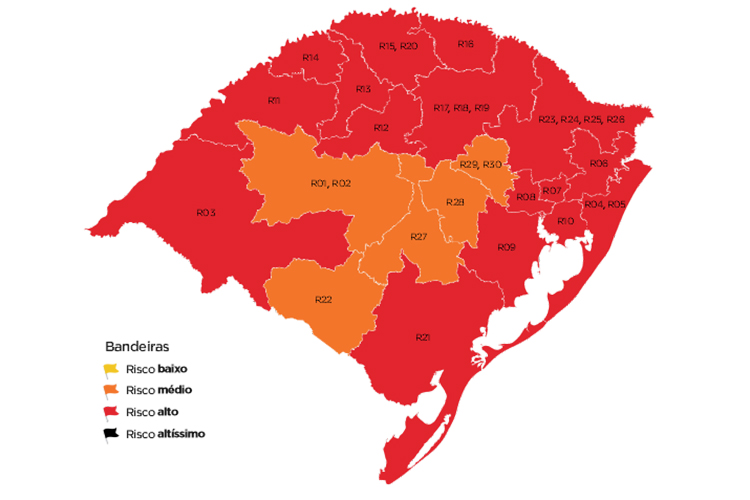 As 16 regiões preliminarmente classificadas com risco alto para o contágio por coronavírus são Uruguaiana, Guaíba, Santo Ângelo, Cruz Alta, Ijuí, Santa Rosa, Caxias do Sul, Capão da Canoa, Taquara, Novo Hamburgo, Canoas, Porto Alegre, Palmeira das Missões, Erechim, Passo Fundo e Pelotas.