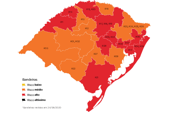 Foi divulgado no fim da tarde desta segunda-feira, 24, o mapa definitivo do modelo de distanciamento controlado do Rio Grande do Sul para a semana entre os dias 25 e 31 de agosto. A região 28, referenciada por Santa Cruz do Sul, teve o recurso negado e ficou na bandeira vermelha, pela primeira vez, desde a adoção do sistema.