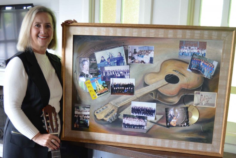 Companheiro inseparável, o violão está estampado no quadro com algumas das principais marcas da trajetória de Maria da Graça na música. Entre elas está a gravação do primeiro CD do Grupo Cantare è Vivere, com músicas do folclore italiano, e um CD solo com repertório italiano de canções românticas, gravado com o professor Mateus Costamilan.