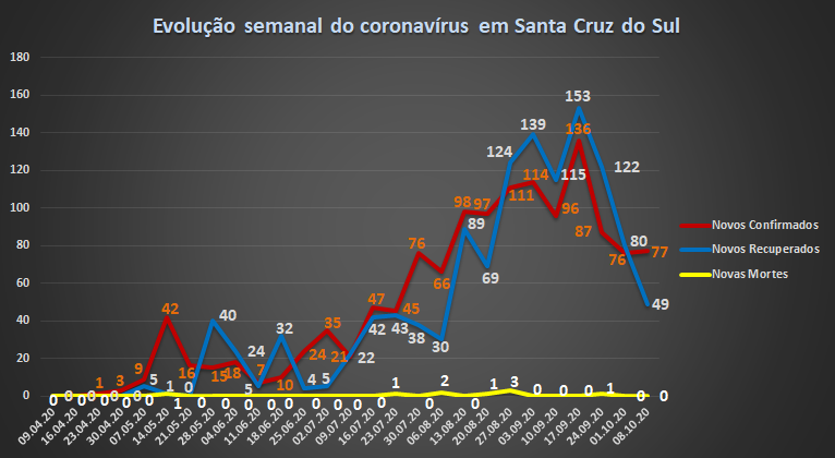 Entre os recuperados, houve queda. São 49 pessoas consideradas nessa condição (foram 80 na última semana). Santa Cruz do Sul tem atualmente 83 casos ativos e, destes, nove estão internados.
