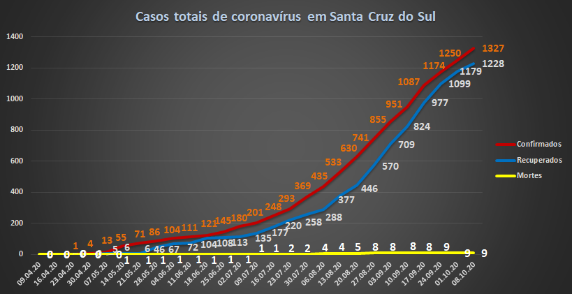 Desde o início da pandemia, 1.327 moradores de Santa Cruz tiveram teste positivo para o novo coronavírus. Destes, 1.228 estão recuperados e nove faleceram.