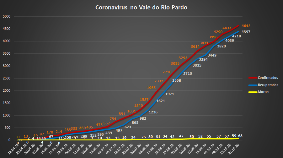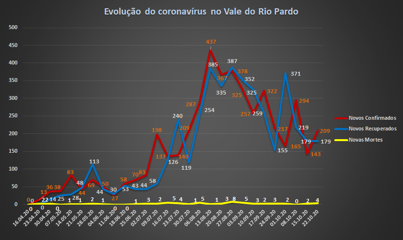 O avanço da pandemia no Vale do Rio Pardo desafia a lógica e mostra grande variação entre uma semana e outra. Na análise anterior, feita com base nos números registrados entre os dias 8 e 15 de outubro, havia sido registrada expressiva queda na quantidade de novos casos da Covid-19. Na análise desta semana, porém, a doença voltou a crescer. Além disso, foram registradas quatro mortes: em Encruzilhada do Sul, Passo do Sobrado, Vale do Sol e em Venâncio Aires.
