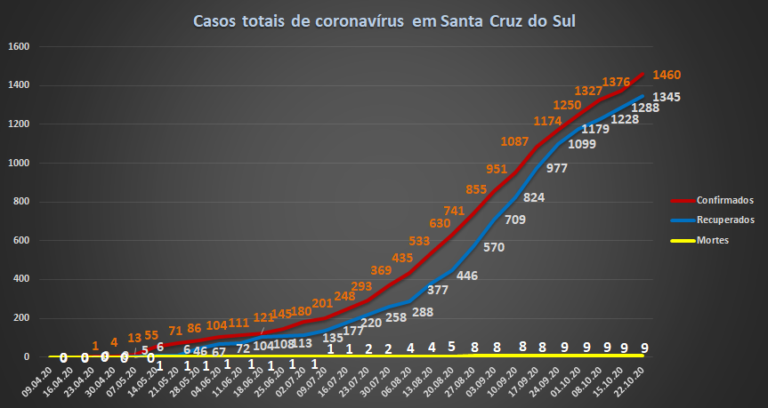 Depois de uma queda significativa na semana passada, quando o município registrou apenas 49 casos, Santa Cruz do Sul voltou a registrar aceleração da pandemia de Covid-19 nesta semana. Somente na última segunda-feira, 19, ainda que a contagem considere os registros represados do fim de semana, houve 47 confirmações, número semelhante ao total da semana passada inteira. Foi o maior número de casos para um só dia desde o início da pandemia. O recorde anterior havia sido no dia 1º de setembro, com 39 positivos.