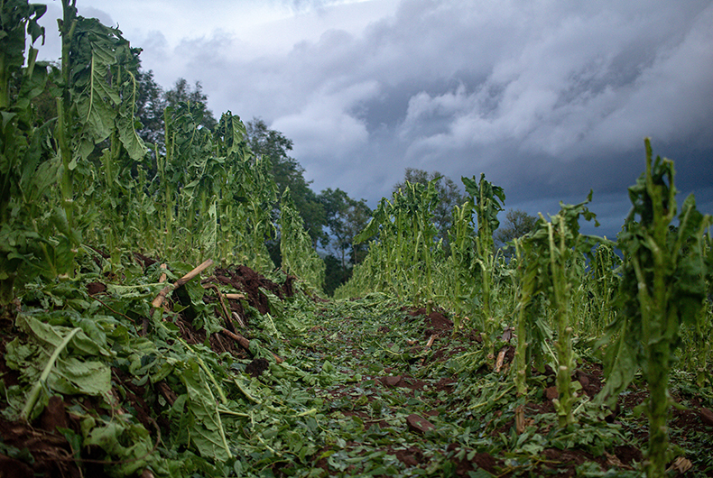 A chuva de granizo ocorrida no domingo, 4, abrangeu grande área no Rio Grande do Sul, com pontos também em Santa Catarina e no Paraná. Os dados da Associação dos Fumicultores do Brasil (Afubra) mostram que mais de 1,4 mil produtores de tabaco notificaram prejuízos à instituição, e a expectativa é de que esse número suba ainda mais. Somente na microrregião de Sobradinho foram 388 propriedades atingidas, a maioria em Arroio do Tigre. Uma força-tarefa de avaliadores foi montada para percorrer os locais no menor tempo possível.
