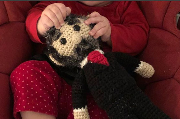 Sem mostrar o rosto da criança, nascida em janeiro, Gregório fotografou a pequena filha brincando com um bonequinho feito de crochê. O brinquedo de pano conta com uma ‘barba’ semelhante à do ex-presidente Lula, vestido com terno e uma gravata vermelha.