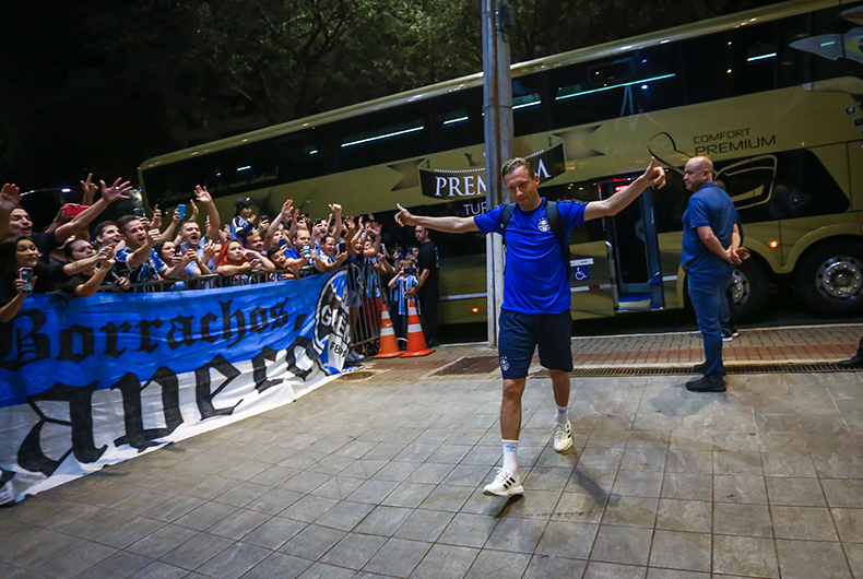Volante Lucas Leiva foi um dos mais saudados na chegada da delegação a Chapecó | Foto: Lucas Uebel/Grêmio FBPA