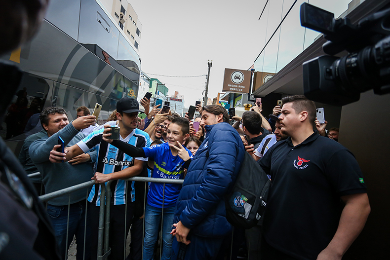 Na chegada nessa segunda ao município catarinense, o zagueiro e capitão Pedro Geromel foi o mais asseadiado pelos torcedores gremistas