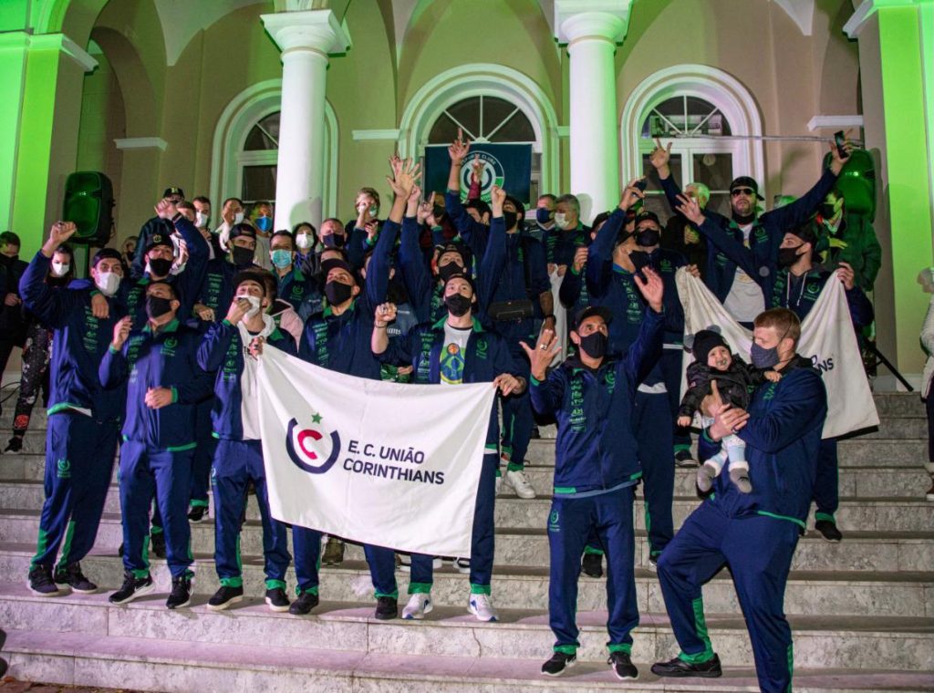 Atletas e comissão técnica do União Corinthians, campeões brasileiros de basquete, foram recebidos nesse domingo, 23, em frente ao Palacinho pela prefeita Helena Hermany, vice-prefeito Elstor Desbessell, secretários municipais e representantes dos patrocinadores. Devido aos protocolos da pandemia, a rápida recepção foi ao ar livre, mantendo o distanciamento e o uso de máscaras e álcool em gel.