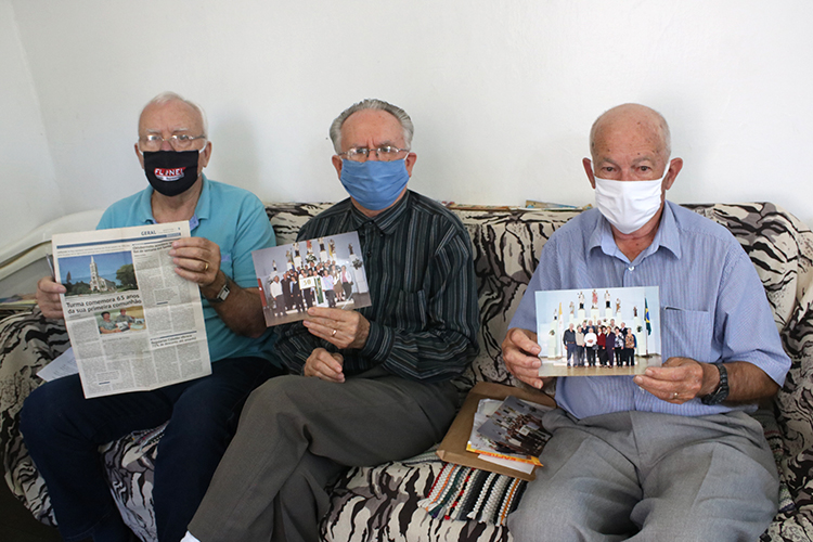 Nelson, Armindo e Wunibaldo mostram as recordações dos encontros anteriores da turma, que fez a primeira comunhão em 1950