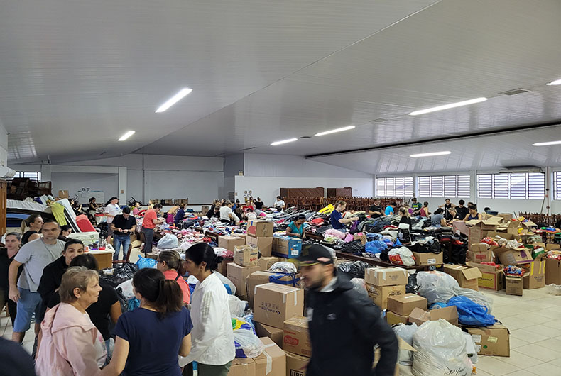 Dezenas de voluntários se mobilizaram nessa quarta, 8, para a triagem de agasalhos, alimentos, produtos de higiene e limpeza vindos de diversas regiões do Rio Grande do Sul e também de outros estados. Segundo a coordenadora, Luciana Tremea, não há mais necessidade de roupas e calçados por enquanto, considerando a quantidade já recebida e a indicação de prefeituras e entidades auxiliadas de que não há demanda para esses itens neste momento.