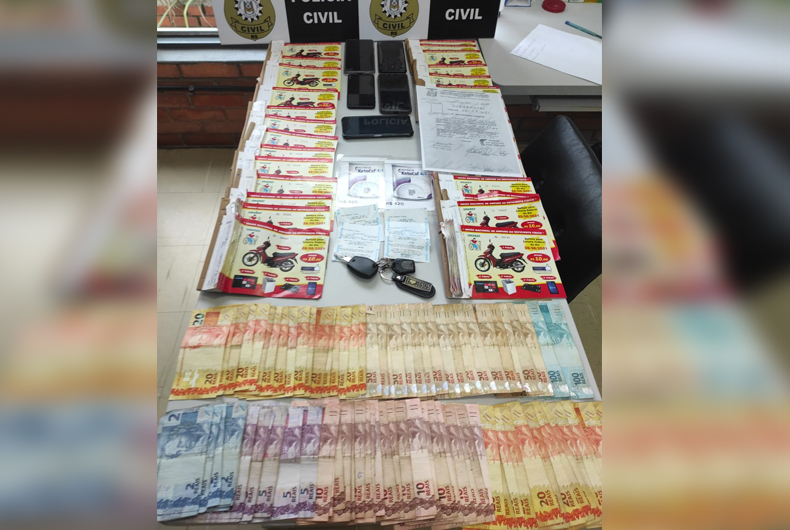 Com os investigados foram apreendidos diversos documentos, como comprovantes de depósitos bancários e blocos de rifas, o valor de R$ 2,1 mil, cinco aparelhos celulares e um veículo Renault Sandero. Foram detidos um homem, três mulheres e uma adolescente, todos da região metropolitana de Porto Alegre.