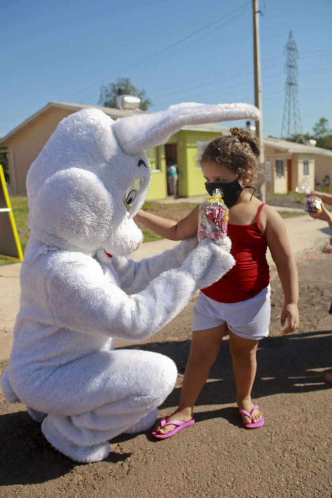 Com os dias ensolarados do final de semana as entregas foram um sucesso, especialmente com a presença de uma das voluntárias fantasiada de Coelho da Páscoa, o que chamou a atenção e motivou abraços e sorrisos das crianças. Uma das organizadoras do recebimento no loteamento Mãe de Deus, Gabriela Nicaretta aprovou a ação. “Para nós é maravilhoso. São poucas pessoas que reconhecem o nosso bairro, e aqui existem muitas pessoas carentes. Os grupos estão sempre trazendo alegria para as crianças daqui, desde o Natal, e agora também na Páscoa”, ressaltou.