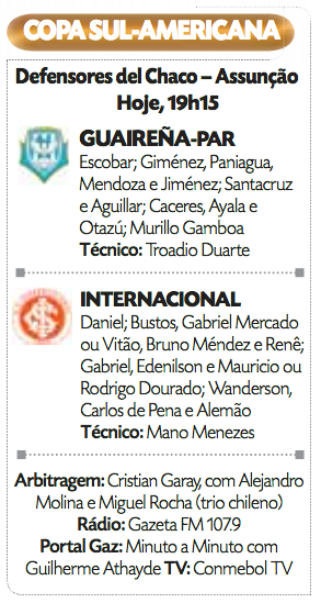 A má notícia é a ausência de Taison na lista de relacionados. Ele sentiu um desconforto na coxa esquerda e acabou sendo vetado pelo Departamento Médico. O Guaireña se apega à Copa Sul-Americana para esquecer a má campanha que vem realizando no Campeonato Paraguaio, no qual perdeu as últimas três partidas e amarga apenas a nona colocação, com 12 pontos em 13 jogos. No último domingo, o time foi derrotado pelo Olimpia por 1 a 0, fora de casa.