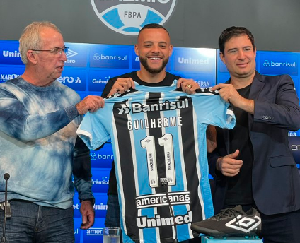 O atacante Guilherme, de 27 anos, foi apresentado pelo Grêmio nesta quarta-feira, 6, no CT Luiz Carvalho. Formado na base do clube, retorna após seis anos para a disputa da Série B do Brasileiro. Ele assinou contrato em definitivo até dezembro de 2024. Natural de Taboão da Serra-SP, surgiu nos profissionais em 2015, mas não teve muitas oportunidades na equipe gaúcha. Teve uma série de empréstimos, começando pelo São José-RS, passando por Botafogo, Chapecoense, Coritiba e Sport. Fora do país, defendeu o Al-Faisaly, da Arábia Saudita, e o Al Dhafra, dos Emirados Árabes Unidos, onde jogava com a 10 e liderava o meio-campo com liberdade ofensiva.