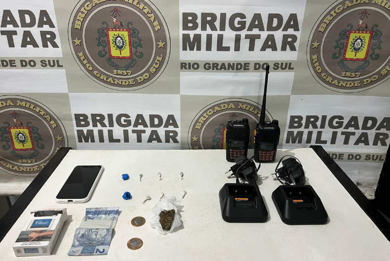 Durante a revista pessoal, foram apreendidas duas porções de cocaína, uma de maconha, seis de crack, um celular, dois rádios comunicadores e dinheiro em espécie. O indivíduo foi preso em flagrante e encaminhado à delegacia para registro.
