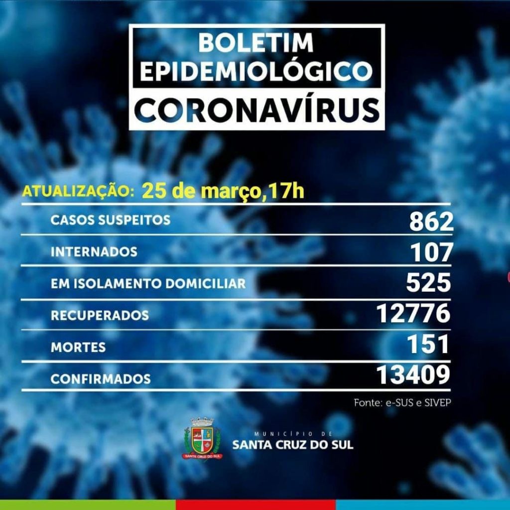 O boletim informa que já são 13.409 casos confirmados no município, sendo 12.776 recuperados. Ainda há 862 suspeitos e 525 pessoas em isolamento domiciliar, além dos 107 internados.