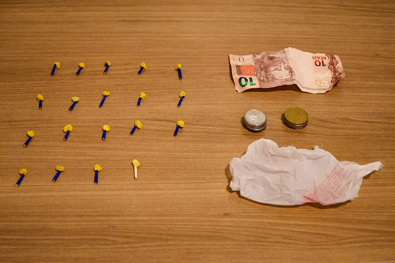 Ao ser abordado, o homem reagiu e os policiais tiveram que algemá-lo e, durante revista, encontraram com ele 18 pedras de crack embaladas para venda e R$ 13,50 em dinheiro. Já com a mulher, foi localizada uma pedra de crack e R$ 50 em dinheiro. Ambos foram conduzidos para a delegacia para registro da ocorrência.
