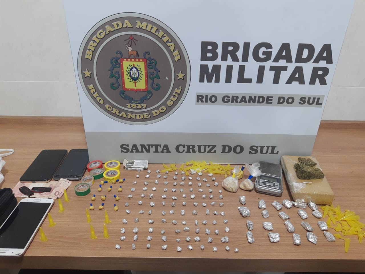 Segundo a BM, o homem de 25 anos tinha dentro de uma sacola uma porção de maconha pesando 455 gramas, 21 porções menores da mesma substância, 121 pedras de crack e mais três porções de crack pesando 31 gramas. Ainda, uma balança de precisão, três celulares, dois pendrives, 32 pinos vazios, quatro pinos de cocaína, material usado para embalar e fracionar entorpecentes e R$ 10,00.