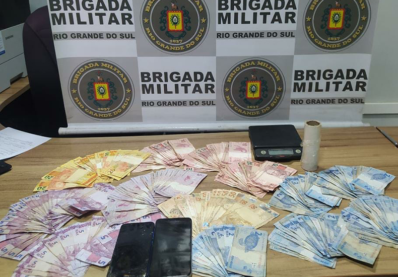 Na abordagem ao preso foi encontrado uma sacola com a quantia R$ 2.418 em dinheiro, uma balança de precisão, um rolo de plástico filme e dois celulares. O preso foi conduzido para Delegacia de Polícia onde o flagrante foi registrado.