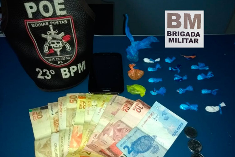Um homem de 22 anos foi preso e dois menores, de 16 e 14 anos, apreendidos por tráfico e associação ao tráfico de drogas. A prisão foi feita pelo Pelotão de Operações Especiais (POE) do 23° Batalhão de Polícia Militar na Rua Coronel Oscar Jost, no Centro de Santa Cruz do Sul, na noite dessa sexta-feira, 20.