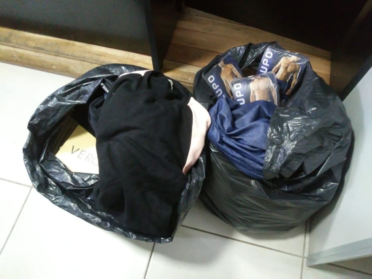 O suspeito foi visto andando pelo telhado da loja, situada na Rua Tiradentes, após escalar o muro. Depois de entrar na loja, ele foi contido. Na revista pessoal, foi encontrado um fone de ouvido no bolso do casaco. A proprietária do estabelecimento compareceu ao local e reconheceu o fone como sendo dela. No local foram encontrados, no chão, dois sacos pretos contendo diversas roupas pertencentes à loja. Os itens foram avaliados em aproximadamente R$ 2 mil.