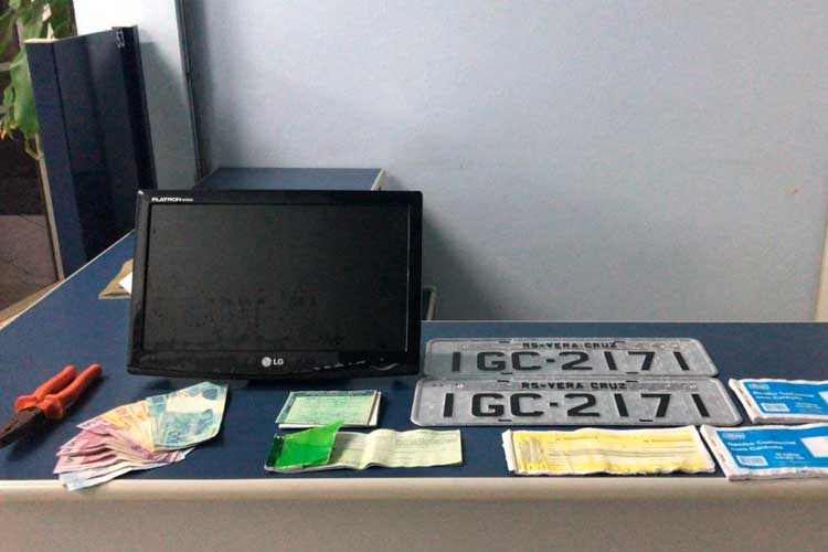 Com o suspeito, foram encontrados diversos objetos do escritório do estabelecimento comercial. Foram apreendidas duas placas, um alicate, um televisor, talões de cheques e recibos, além de R$ 414,00. Ao ser abordado pelos policiais, o homem estava com uma bicicleta, que também foi apreendida. Quando as vítimas chegaram à Delegacia de Polícia, reconheceram também o veículo.