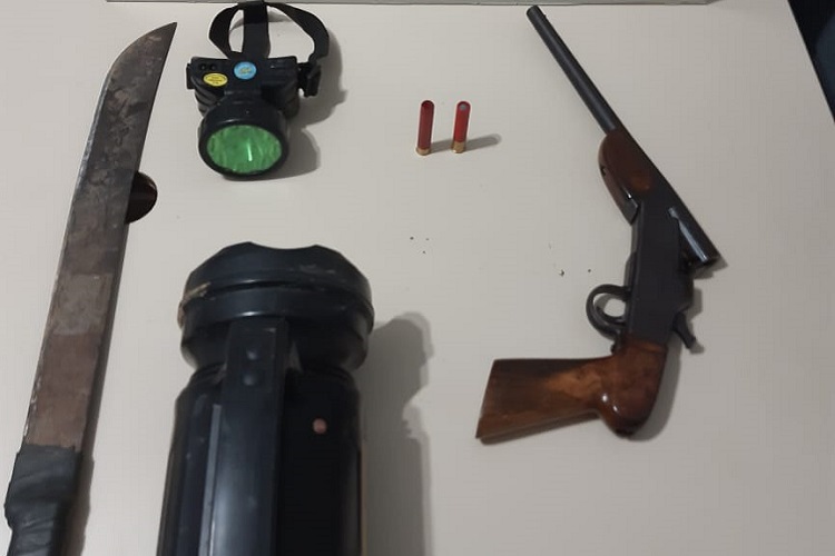 Os policiais encontraram o veículo e uma arma de fogo calibre 36 municiada dentro dele. Próximo ao carro estava o acusado, com um animal já abatido, munição deflagrada do mesmo calibre, duas lanternas e um facão. Todos os itens foram apreendidos. Ele foi detido e encaminhado à Delegacia de Polícia, onde o caso foi registrado.